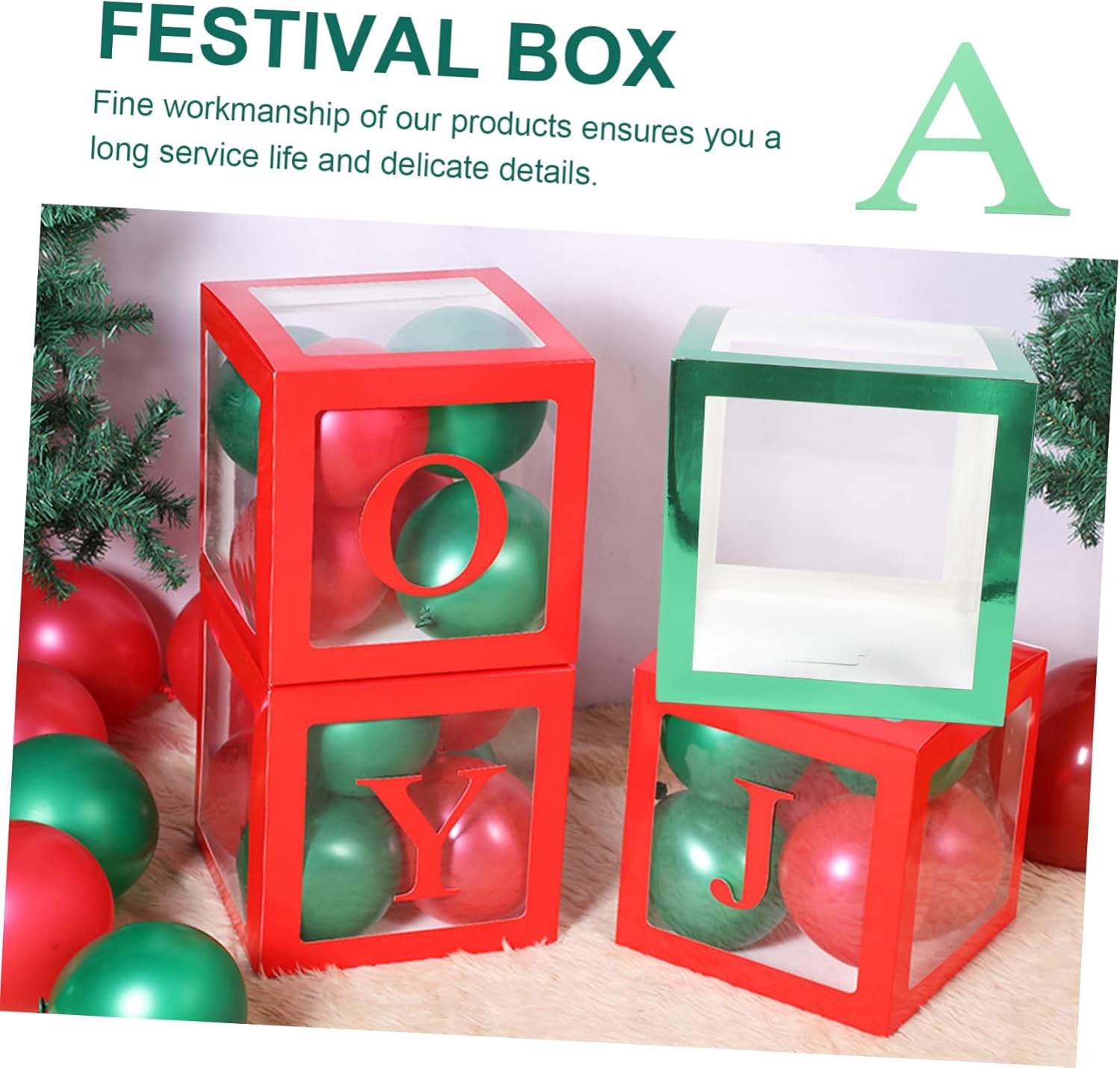Package List 4 x green boxes 1 x set of XMAS paper cards Characteristics -Material: Plastic, paper Display Xmas Case -Package Size: About 32.00x32.00x3.00cm/12.60x12.60x1.18in Balloon Case Supply -Color: Green Christmas Balloon Case - for home, living room, shop, hotel, office, shopping mall, garden, and other places Party Balloon Case. -The transparent boxes with green border, provide a warm and cozy Christmas decoration scene Party Prop. -The boxes can be filled with balloons or any other items to make them for the event Balloon Boxes for Christmas. -Fine workmanship of our products ensures you a and delicate details Party Supply. -Simple installation and operation, convenient and quick, easy for you to use on Xmas Party Balloons Case.Goods InformationChristmas Balloon Case This product is a set of balloon boxes with cards.Party Balloons Case want something wonderful to decorate your Christmas party? Then, this product is a choice.Display Xmas Case With Christmas theme letter "XMAS", it is a set of Christmas party supplies