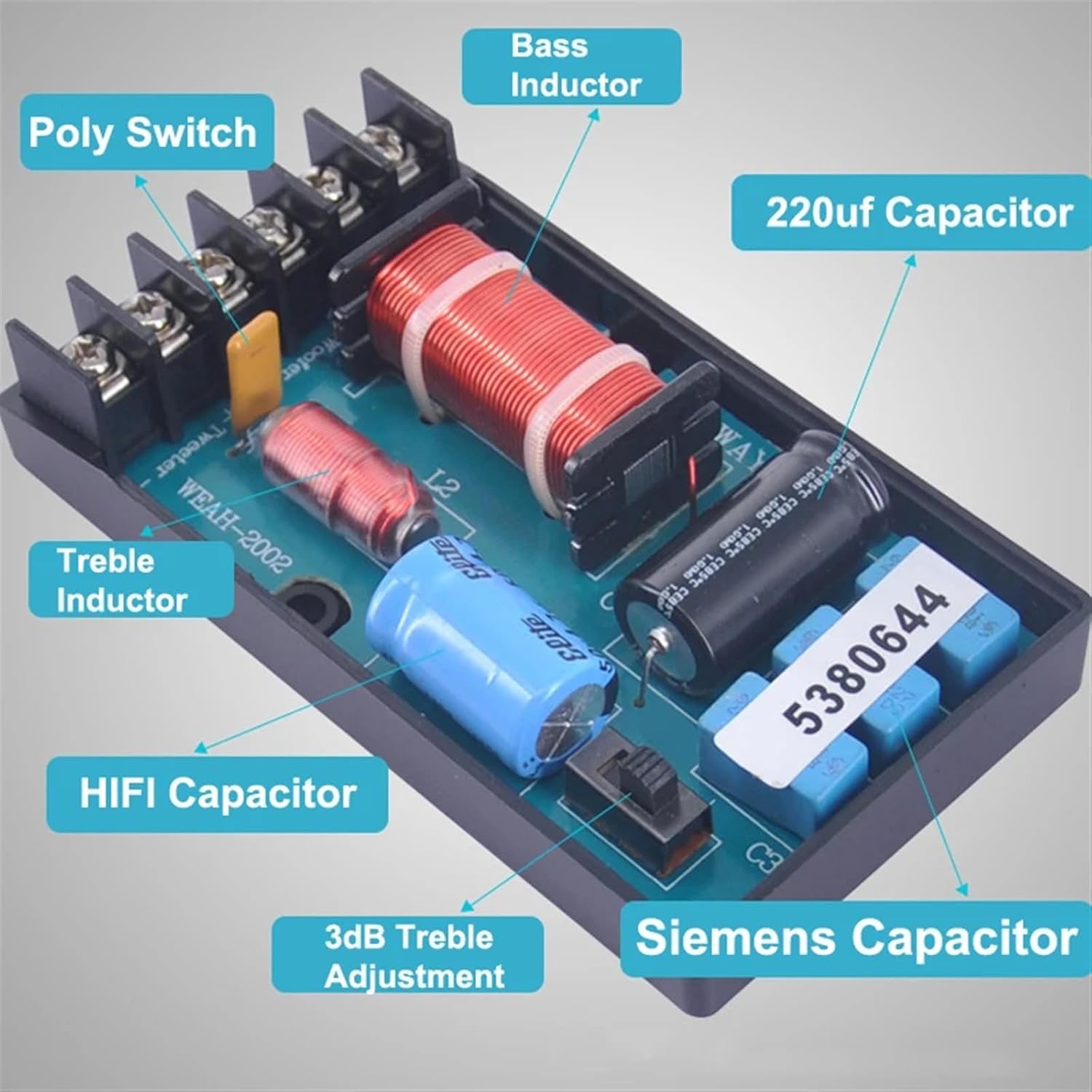Frequency DividersSpecificationsProduct Name: 2 Way Frequency DividerIntersect Frequency: 3000HzFilter Circiut: Low (12db / oct)High (12db / oct)Impedance: 4-8 ohmRated Power: 120WSize: 120*65*33mmWeight: 190g/PiecePackage Included:2PCS Frequency Dividers