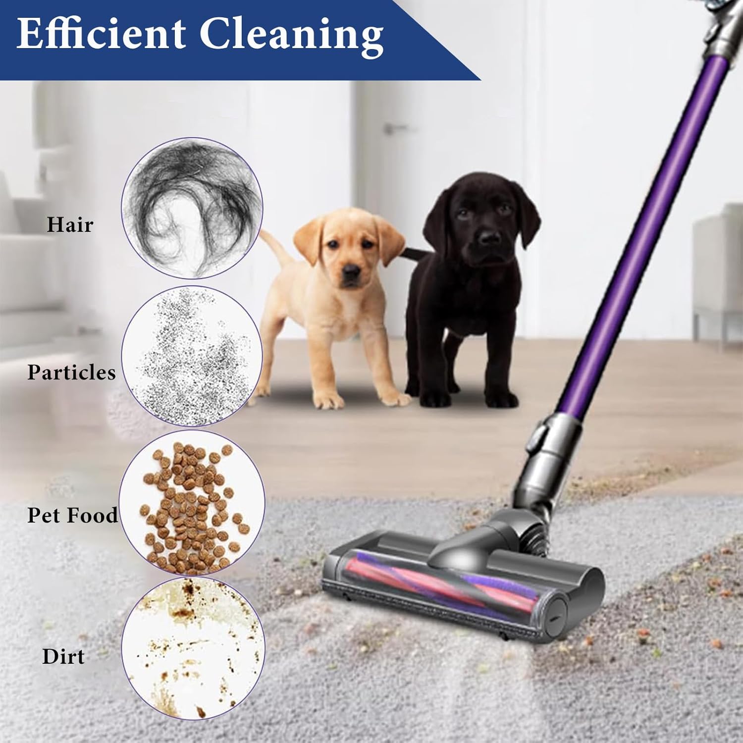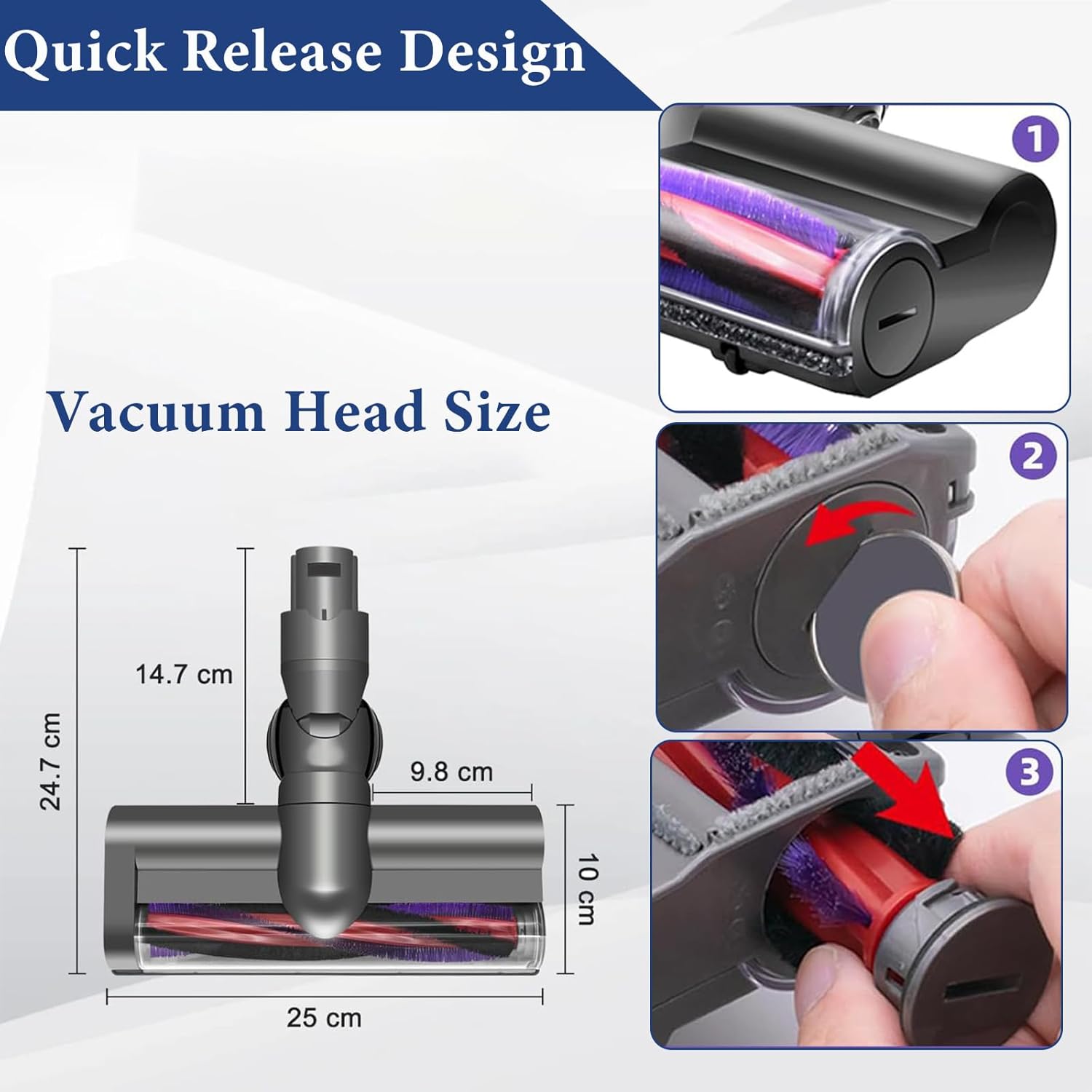 Features: Compatible Models: Brush head replacement for Dyson V6, DC58, DC59, DC61, DC62, DC72, DC74, SV04, SV06, and SV09 cordless vacuum cleaner, please check your machine model before purchasing Quick Release Design: Boasts a quick-release design for hassle-free attachment and detachment. Rotating the end cap with a coin, the washable and reusable roller brush can be disassembled in a few seconds, which is easy for regular maintenance Efficient Cleaning: The carbon fiber brush with its powerful suction make it easy to vacuum the dust and particles on all kinds of flooring like carpet,hardwood floor and tile, and won't cause any damage, allows your deep cleaning action anywhere you need it. 180° Flexible Rotation: Brush head can 180° rotate from left to right and 90° from front to back, smooth movement, easier cleaning. The V6 floor brush glides under furniture and cabinets easily to eliminate dust and debris that is hard to reach Suit for Different Floors: Designed for superior cleaning on carpets, hardwood floors, and tiles. Regular cleaning and maintenance of the brush head ensure continued efficiency and longevity Package Includes: 1* Vacuum Head Replacemnt Note: 1. The actual color of the item may vary slightly from the pictures shown on the website. This can be caused by many factors such as brightness of your monitor and lighting brightness. 2. Please allow slight manual measurement deviation for the data.