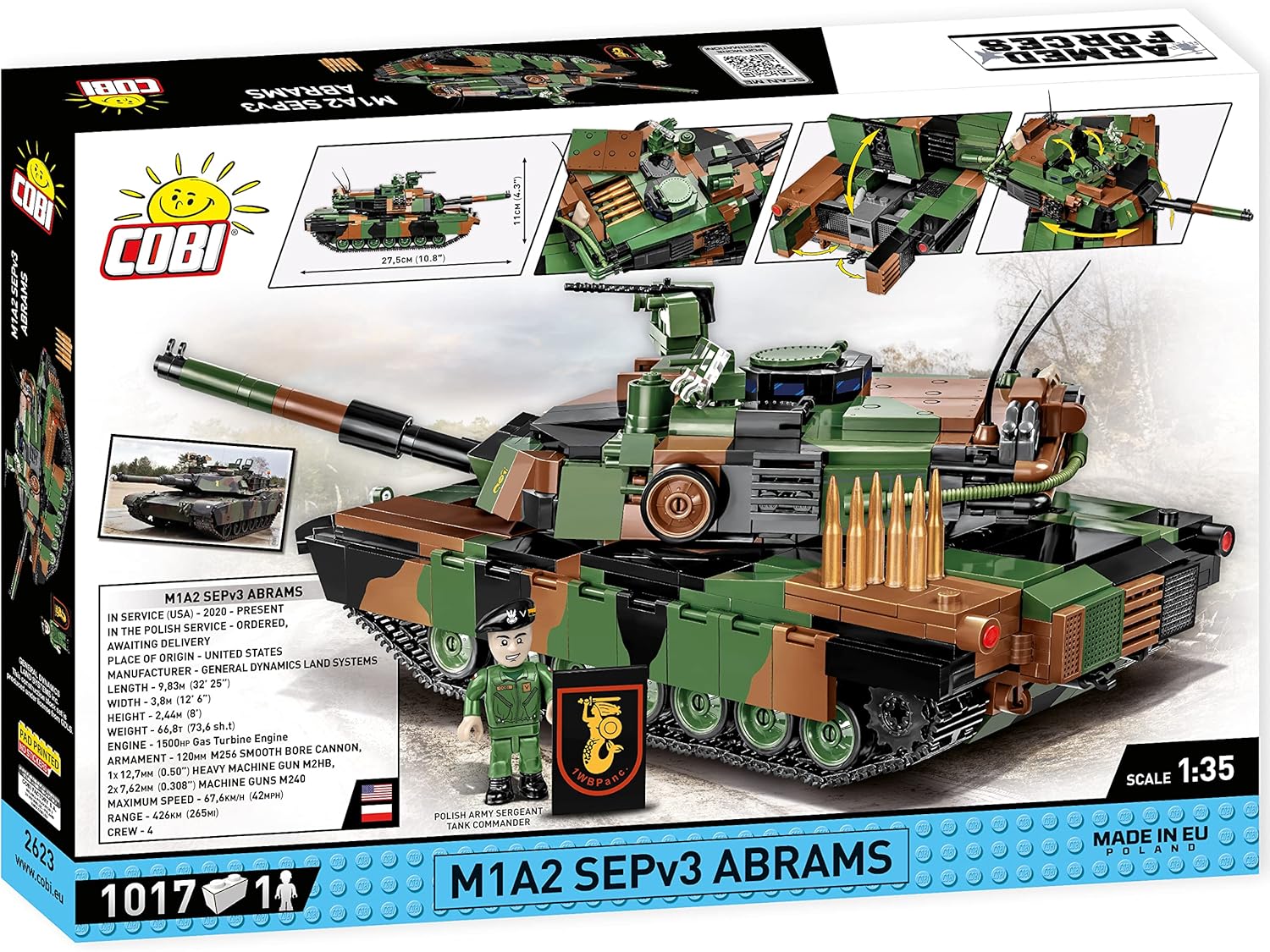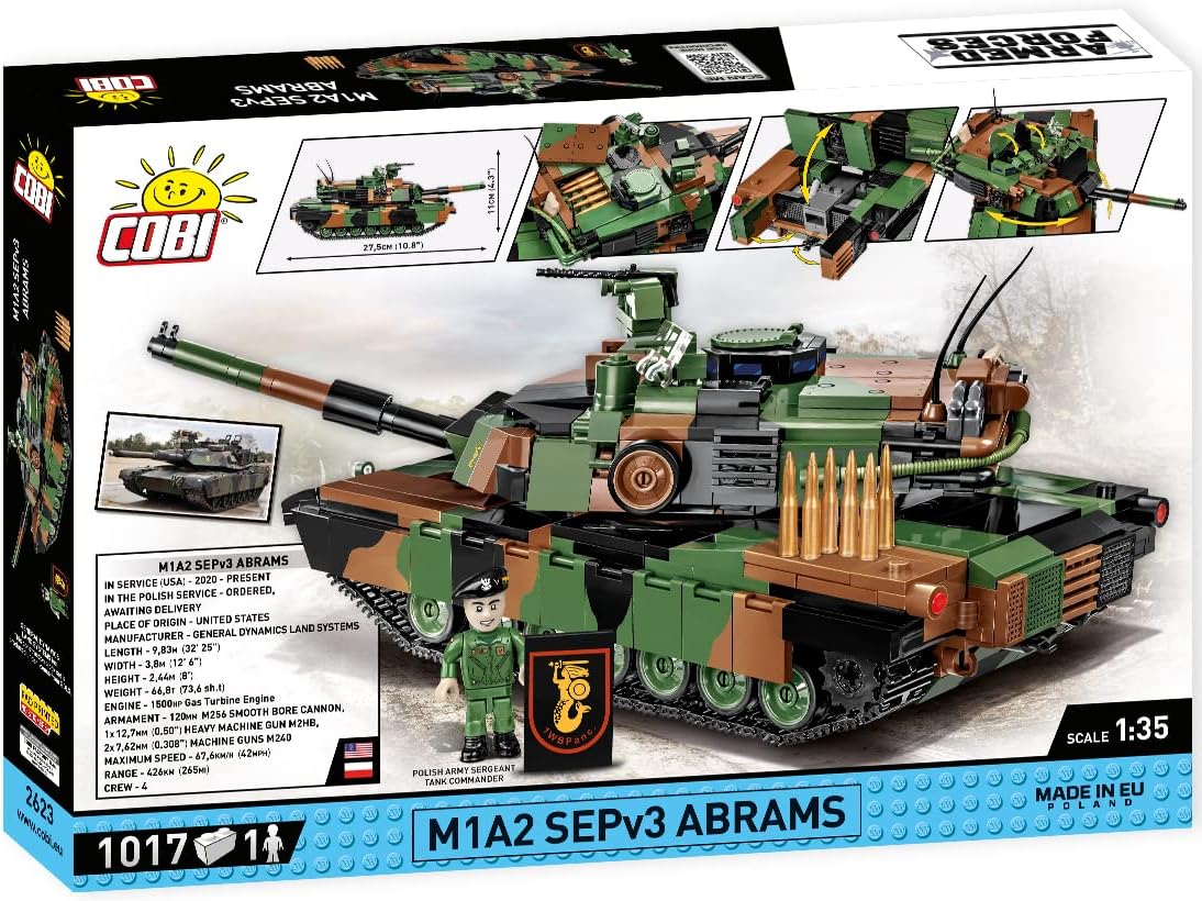 This is the most modern variant of the M1A2 SEPv3 Abrams tank, in the colors of the 1st Warsaw Armored Brigade and named after Tadeusz Kościuszko. The new Abrams set was developed under the license of the American defense company General Dynamics Land Systems. Poland has ordered 250 tanks of this type, and now you can see what these state-of-the-art tanks will look like in the Polish Army! The block model has been reproduced in a sensational 1:35 scale with attention to maintaining the maximum amount of details. It became possible thanks to the use of new blocks from the ever-growing catalog of elements created by COBI. Abrams is one of the best tanks of the modern battlefield! It has been produced since 1980 by the American defense company General Dynamics Land Systems. The tank is constantly being modified to meet new standards that increase its combat value. The latest production version is the M1A2 SEPv3. The Abrams is equipped with the most modern electronic systems and perfectly protects its crew. Abrams tanks were first used in combat in the early 1990s during Operation Desert Storm. Since then Abrams have been involved in successive military conflicts involving the United States. This set recreates its appearance in the Second Gulf War in 2003. They are also a hot export commodity.