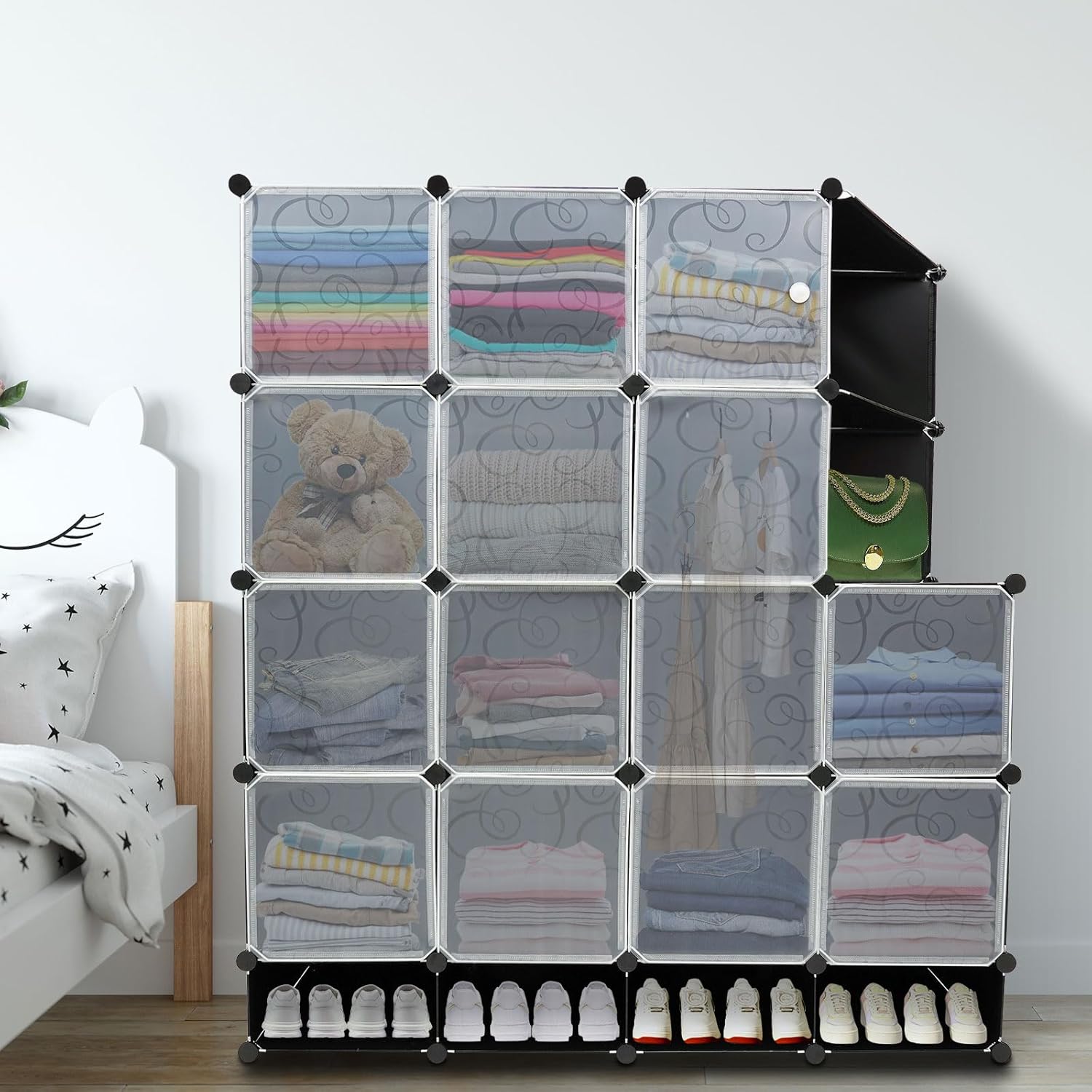 Description Does your room always look cluttered as too many clothes piled up? If the answer is yes, then this cube storage organizer will be ideal for you. This product is made of high-quality materials and can be used for a long time. It adopts a partition design, which is convenient for categorizing and storing items and keeping the room tidy. The minimalist design makes it fit well into a variety of room types. Details Comfortable Handle: The rounded and comfortable handle makes it easy for you to open and close the door. Door Hook: It ensures that the doors fit tightly and prevents dust and cockroaches from entering. Practical Tie: It can connect the adjacent cabinet doors, making it easy to open them at the same time. Smooth Edge: The rounded and smooth edges not only add to the aesthetics of the product but also improve the safety of use. Application This product is suitable for an entryway, living room, study, bedroom, cloakroom, children's room, office, and so on. Ideal for organizing clothes, books, photos, toys, bags, CDs, artwork, decorations, shoes, handbags, and many other lightweight items. Specification Color: Black Style: Modern Shape: Rectangle Material: PP, Iron Process: Spray Plastic Assembly Required: Yes Installation Type: Freestanding Recommended Uses For Product: Garment, Shoes Each Compartment Maximum Load Capacity: 3-4kg/ 6.61-8.82 lbs Number of Doors: 14 Bottom Height: 18cm/ 7in Each Compartment Width: 37cm/ 14.5in Product Size: 147*47*165 cm/ 57.8*18.5*65 in Notes 1.Please read the installation diagram completely before use. And pay particular attention to the safety instructions included. 2.Please allow the slight color difference caused by the shooting light and the 1-3 cm error due to manual measurement, and make sure you do not mind before ordering.