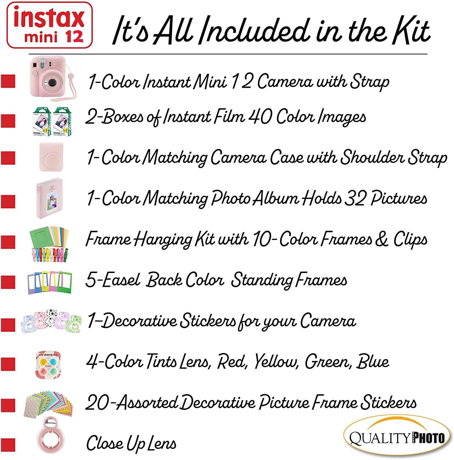 Value accessory bundle. Includes the famous Fujifilm Instax Mini 12 Camera (color your choice) with a matching Camera Case to keep the camera protected. 40 Fujifilm Instax Films so you can use your brand new camera right away! Photo Album, perfectly sized for the instant prints. Many more accessories including frames to hang and decorate you photos, stickers, close up color lenses, and camera sticker for added color. The newly updated Fujifilm instax Mini Camera 12 features a slim body with newest design. Parties, birthdays anniversaries, carnivals or gifts... all are times to use the Fujifilm Instax Camera, You will not regret the Mini 12 buy. The most valued gift bundle for the best price!