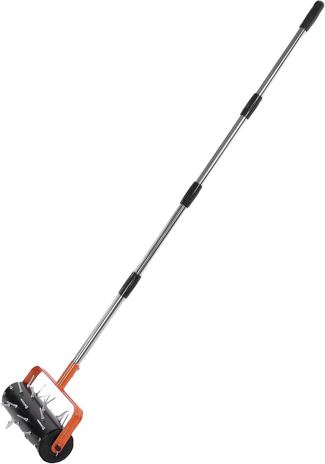 1. Rolling Lawn Aerator: The rolling lawn aerator will penetrate and loosen the soil, effectively solving the problem of soil compaction and promoting the growth of lawn roots. 2. Stable Rolling: The sharply teeth have a unique spiral pattern that ensures stable, continuous rolling, minimizing vertical jumps, ensuring high stability. 3. 42 Enhanced Spikes: 42 spikes are heat treated, with increased hardness and strength, resisting deformation, ensuring enhanced performance, durability and efficiency. 4. Steel Construction: The aerator is made of premium steel, ensuring durability and long lasting use. The inside of the roller can be filled with sand or stones to add extra weight, allowing the spikes to penetrate deeper into the soil. 5. Height Adjustable: The handle consists of four parts, can be adjusted to the desired height according to your needs. The rubber handle is anti slip and comfortable to grip. Pre installed with all spikes, making installation easier, allowing for quick setup. Spec: Item Type: Rolling Lawn Aerator Material: Stainless Steel, Steel Weight: Approx. 5540.00g / 195.42oz How to Use: Directly use. Package List: 1 x Rolling Lawn Aerator (6 Assembly Parts) 2 x Screws 2 x Nuts 2 x Pins 2 x Washers 1 x Wrench 1 x Hex Wrench Note: Please water thoroughly before use to keep the soil moist, especially in hard and dry conditions.
