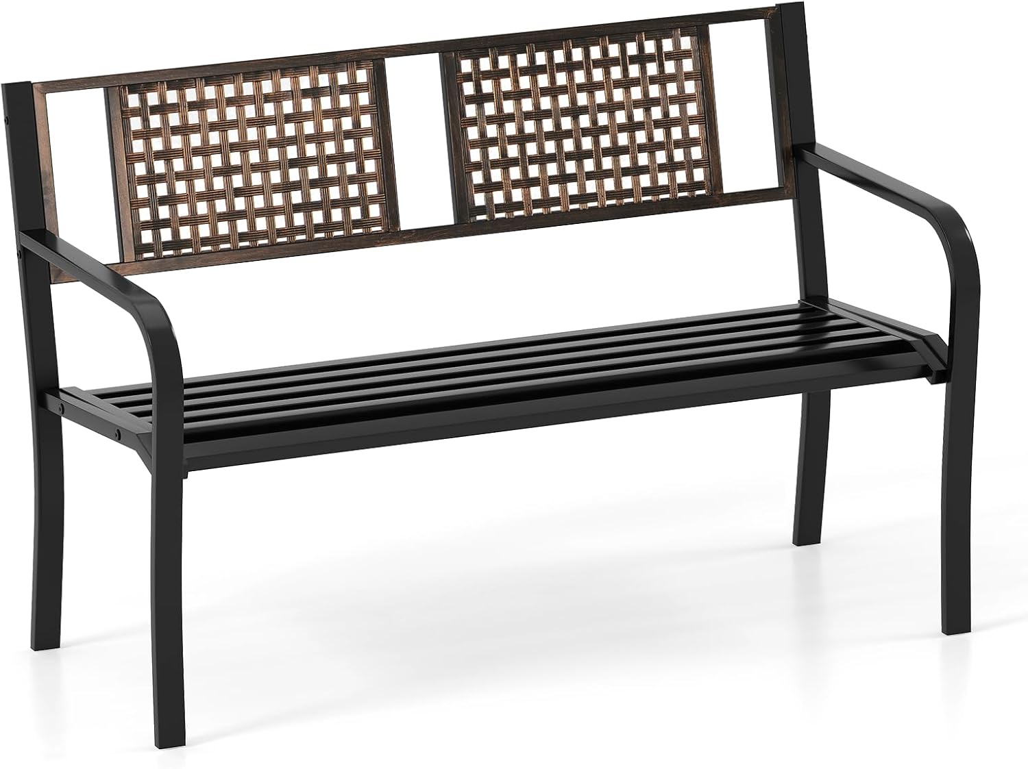DescriptionThe garden bench is made of steel and PVC which features rustproof and water-repellent, so it can be used outdoors for a long time. The sturdy steel frame ensures that the bench is stable and heavy-duty. The large seat allows you to enjoy happy moments with friends or family on the bench. Thanks to the ergonomic design, the park bench offers a high level of seating comfort. In addition, it looks classic in its black color and is a decorative eye-catcher in the garden.FeatureMade of steel and PVC, it is robust and durableWeatherproof and stable structure is suitable for outdoorsThe large seat can accommodate 2-3 peopleErgonomic design for a high level of seating comfortRounded armrests offer a pleasant feelingClassic color and elegant look complement each otherEasy to assemble and cleanSpecificationColor: BlackMaterial: Steel + PVCOverall Dimension: 46” x 20” x 30”(L x W x H)Net Weight: 21 lbsMax. Load Capacity:500 lbsPackage Includes:1 x Garden Bench1 x Instruction