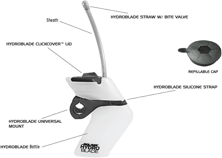 HYDROBLADE ROADThe most convenient vertical hydration system available. Places your hydration within easy reach and allows you to drink without taking your hands off the bars. Designed for road and flat bar fitness bikes. Easy to mount, easy to clean, easy to use. Easy to Drink & RefillDesigned to provide the hydration you need, when you need it, all without sacrificing bike control.Hands-free drinking. Simply sip from the straw, keeping your eyes on the road ahead.CLICKCOVER features a grippy pull-tab for opening. Simply pop open and refill.Top-of-the-line bite valve decreases bloating by reducing air intake when sipping.Large 828 mL (28 oz) capacity. Durable BPA-free high-density plastic bottle.Clean, Aerodynamic DesignEngineered to provide the most aerodynamic advantage of any vertical hydration system available.Designed using Computational Fluid Dynamics (CFD) to help optimize aerodynamic shape, minimizing system drag.Flow straighteners re-direct and channel air for added drag reduction.Narrowest profile of any competing vertical hydration system.Quick & Easy InstallationMounts onto most fitness, drop or flat bar bikes using the included mount, silicone strap and 4 securing bolts.Installs in less than 5 minutes with step by step instructions.Bottle easily slides out of mount for cleaning. Simply unfasten the the HYDROBLADE SILICONE STRAP and slide bottle out.